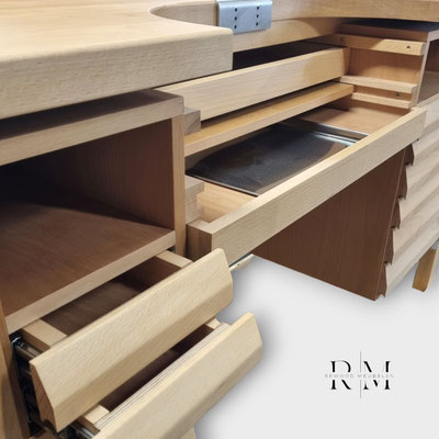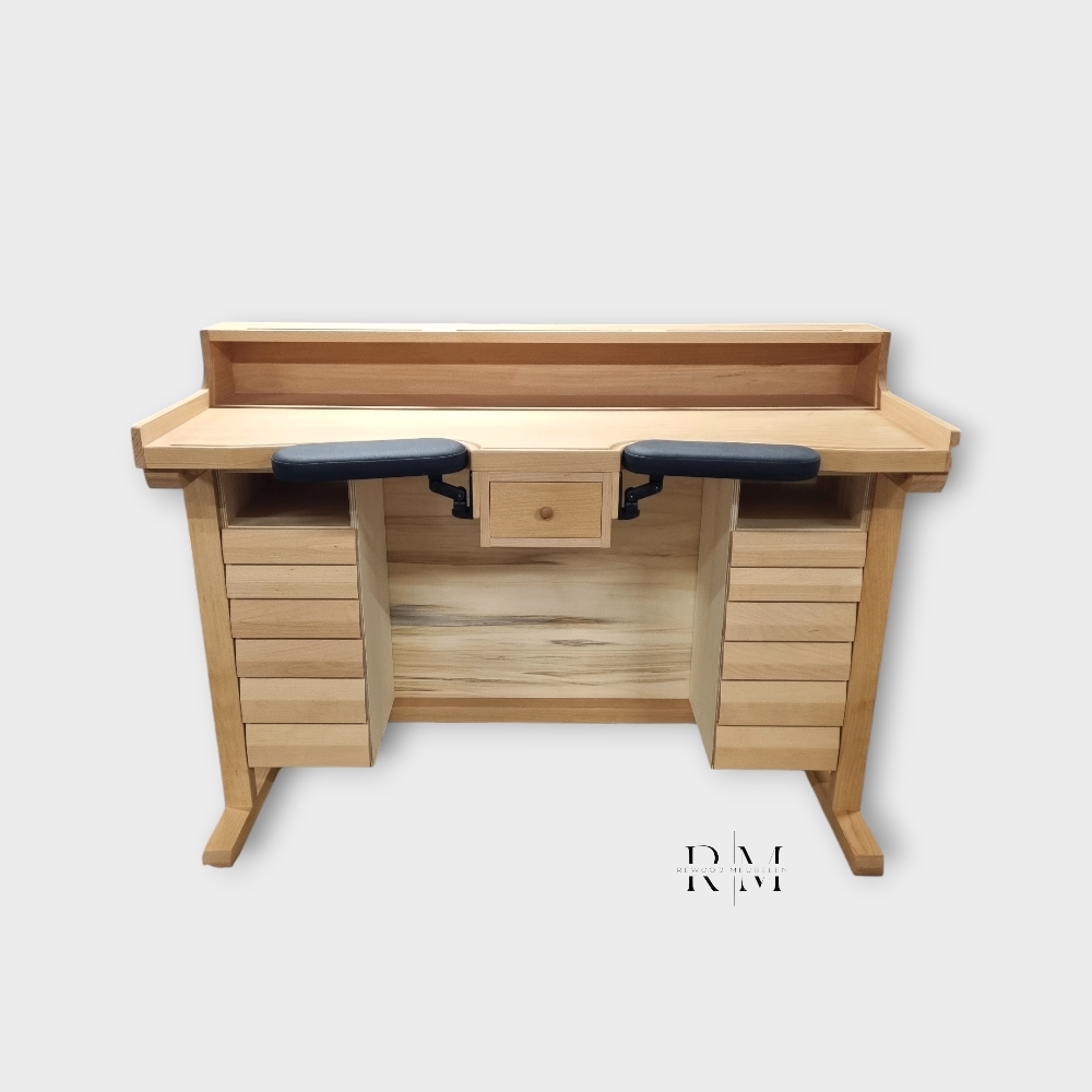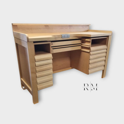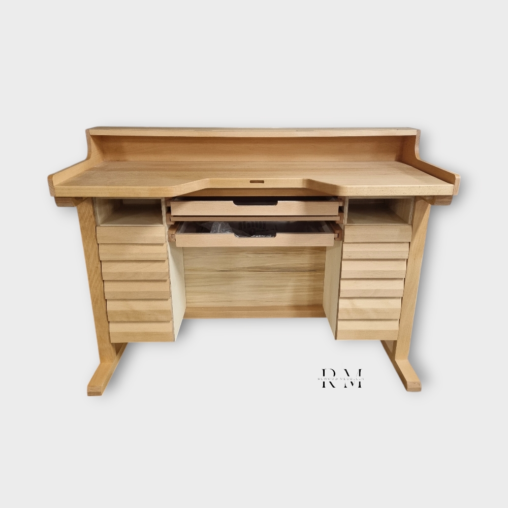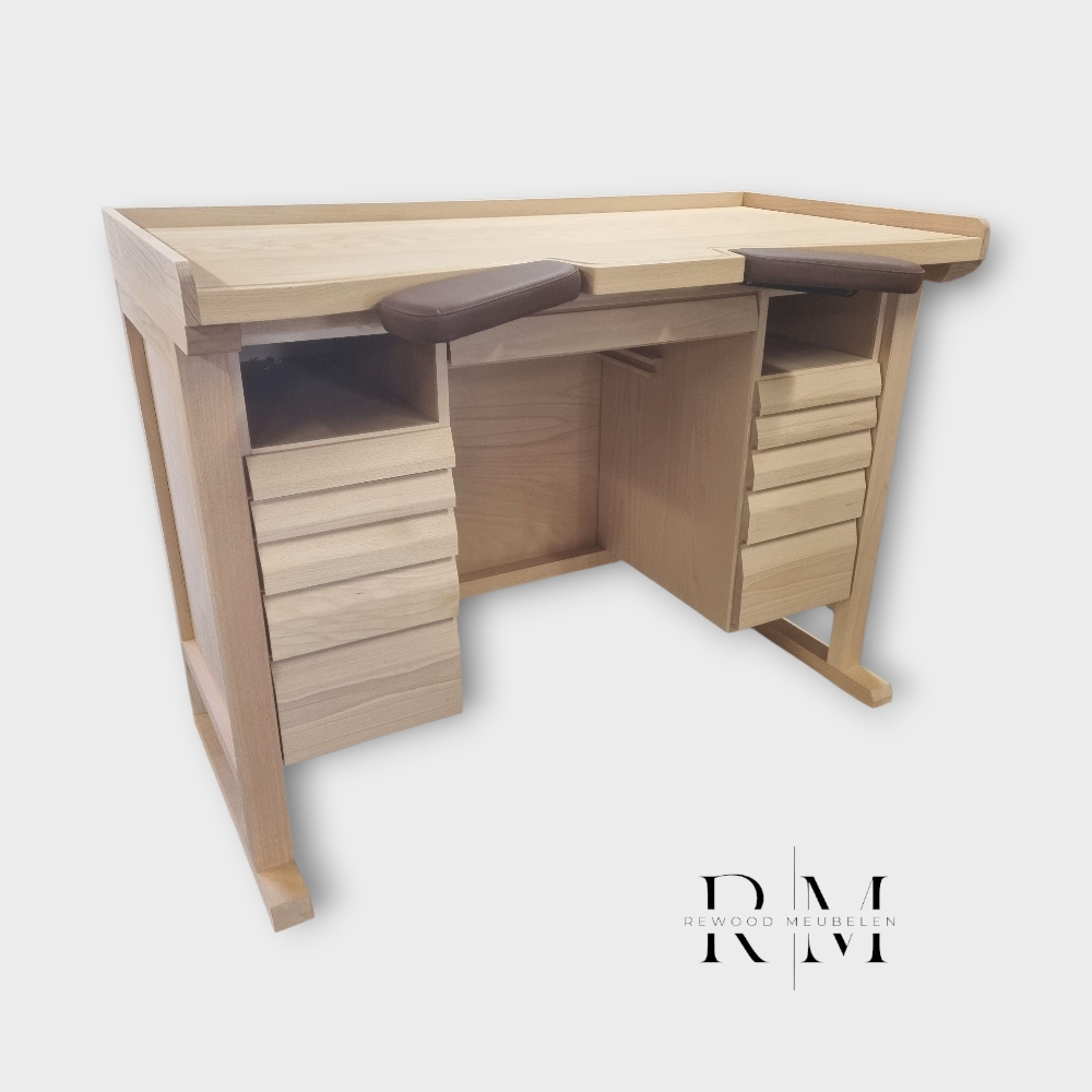 Voor een juwelierszaak met een open atelier twee net iets verschillende op maat gemaakte werkbanken van volledig massief beuk met voorbereiding voor de GRS Benchmate.