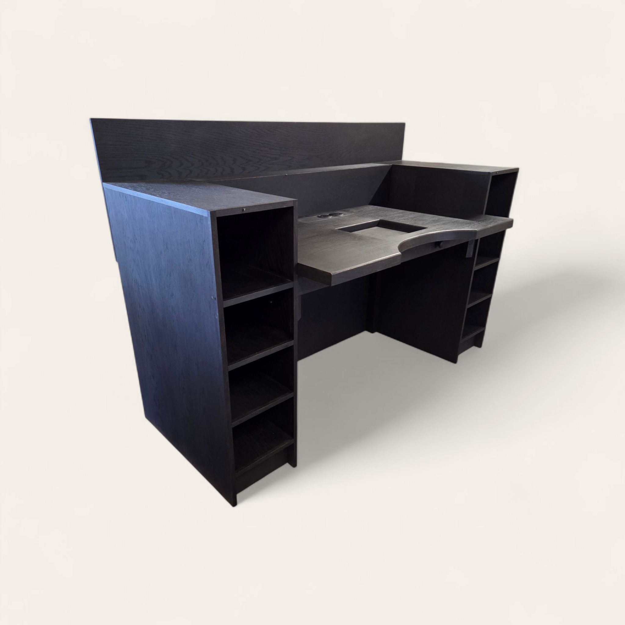 Voor een edelsmid 2 identieke op maat gemaakte edelsmid werkbanken in volledig beuk. 160 cm breed en 80 diep. Afgewerkt met een hardwaxolie in de Tint Graphit. Uitgevoerd met gebogen opvanglades.