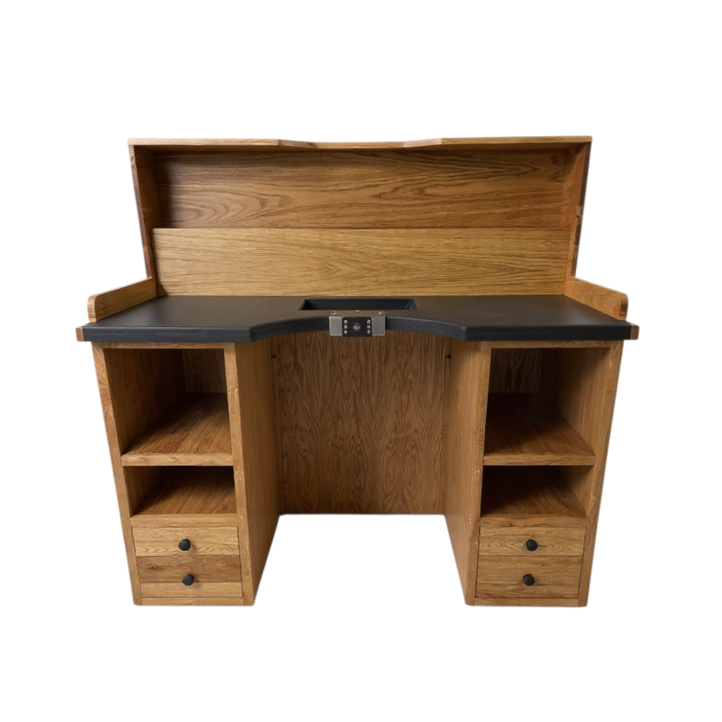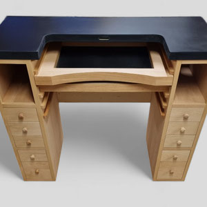 Volledig massief eiken werkbank voor een juwelierszaak met soldeerlade en gebogen opvanglade voor slijpsel.
