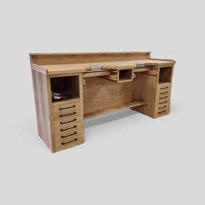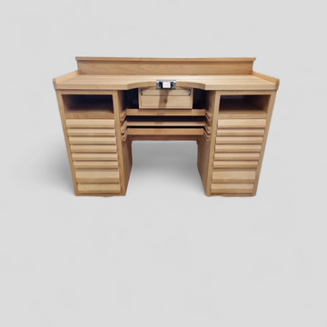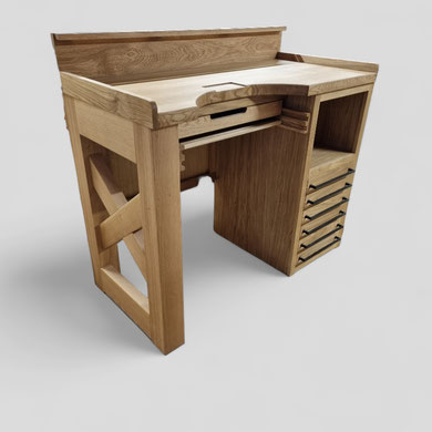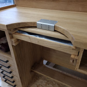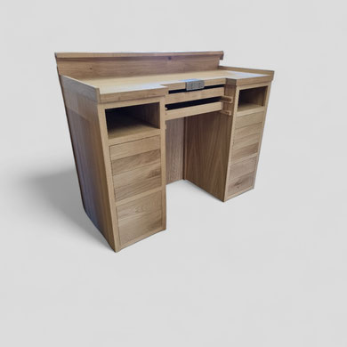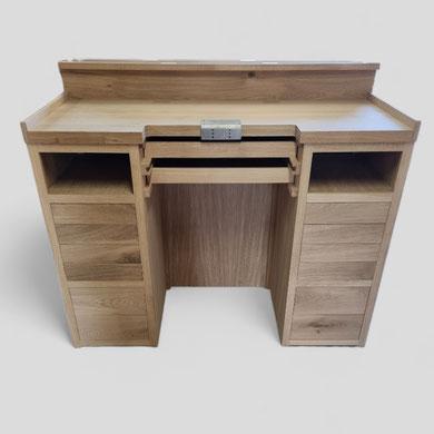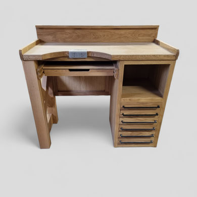 Werkbank 135x70 volledig massief in eik uitgevoerd met greep loze lades en gebogen opvanglade.