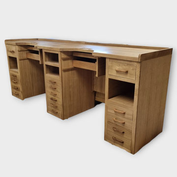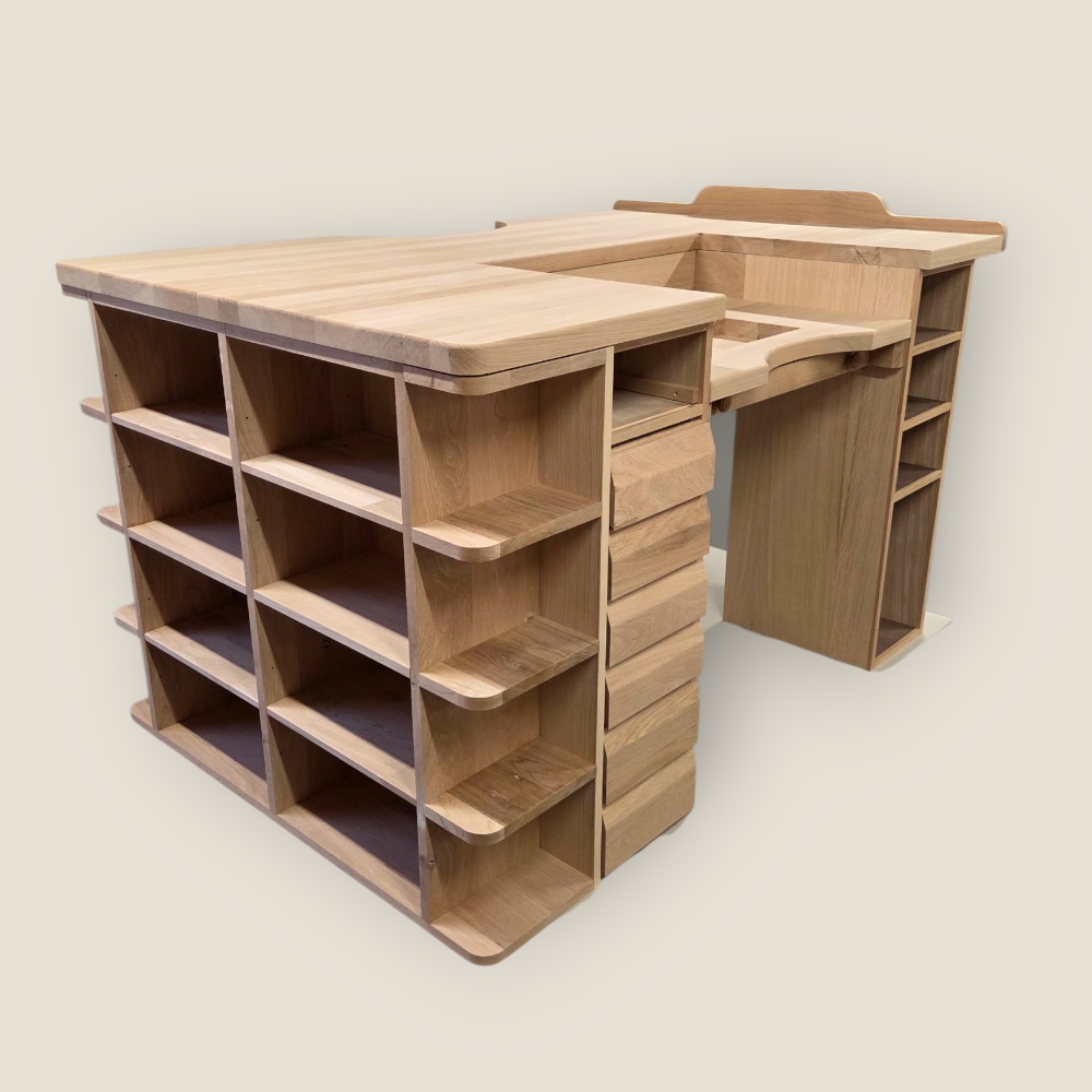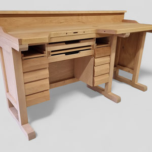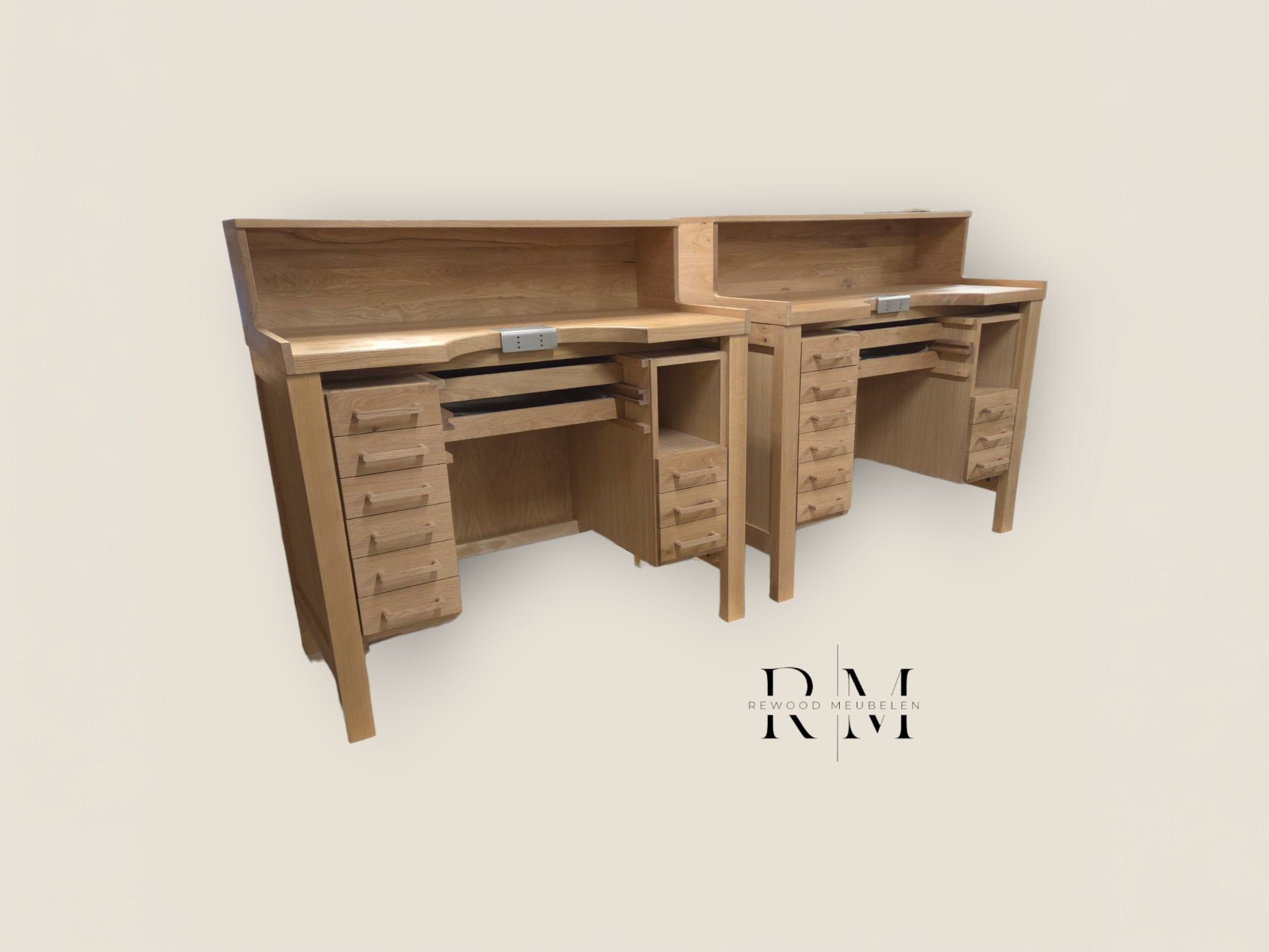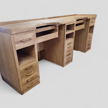 Op maat gemaakte edelelsmid werkbank Eik met 2 verschillende werkplakken met lades op gelagerde geleiders.