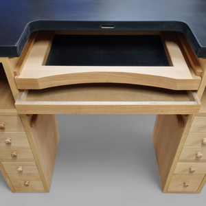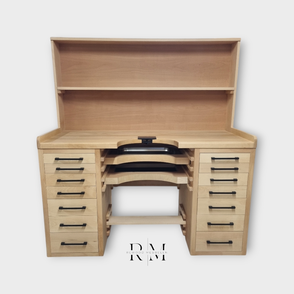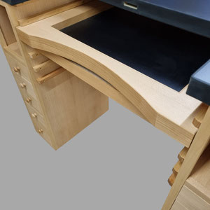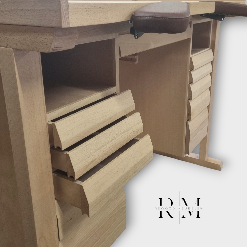 Op maat gemaakte edelsmid werkbank Beuk 160x60 met 2 verschillende ladeblokken met lades op gelagerde geleiders.