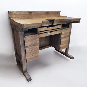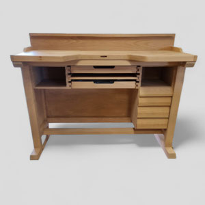 Op maat gemaakte edelsmid werkbank in volledig eik. 120 cm breed met soldeerlade en gebogen opvanglade.
