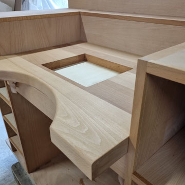 Op maat gemaakte zetters werkbank in Eik, uitgevoerd met lades op gelagerde geleiders.