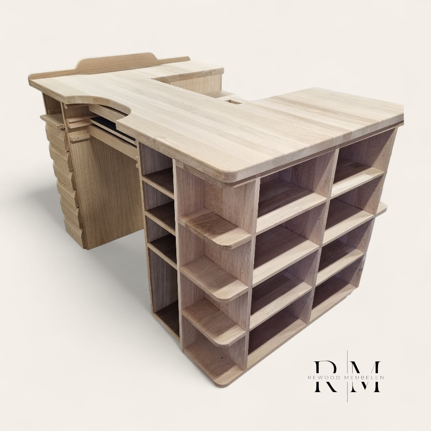 Op maat gemaakte dubbele edelsmid werkbank in volledig eik (170x122 cm) Uitgevoerd met een extra vakkenkast. Afgewerkt in de tint terra.